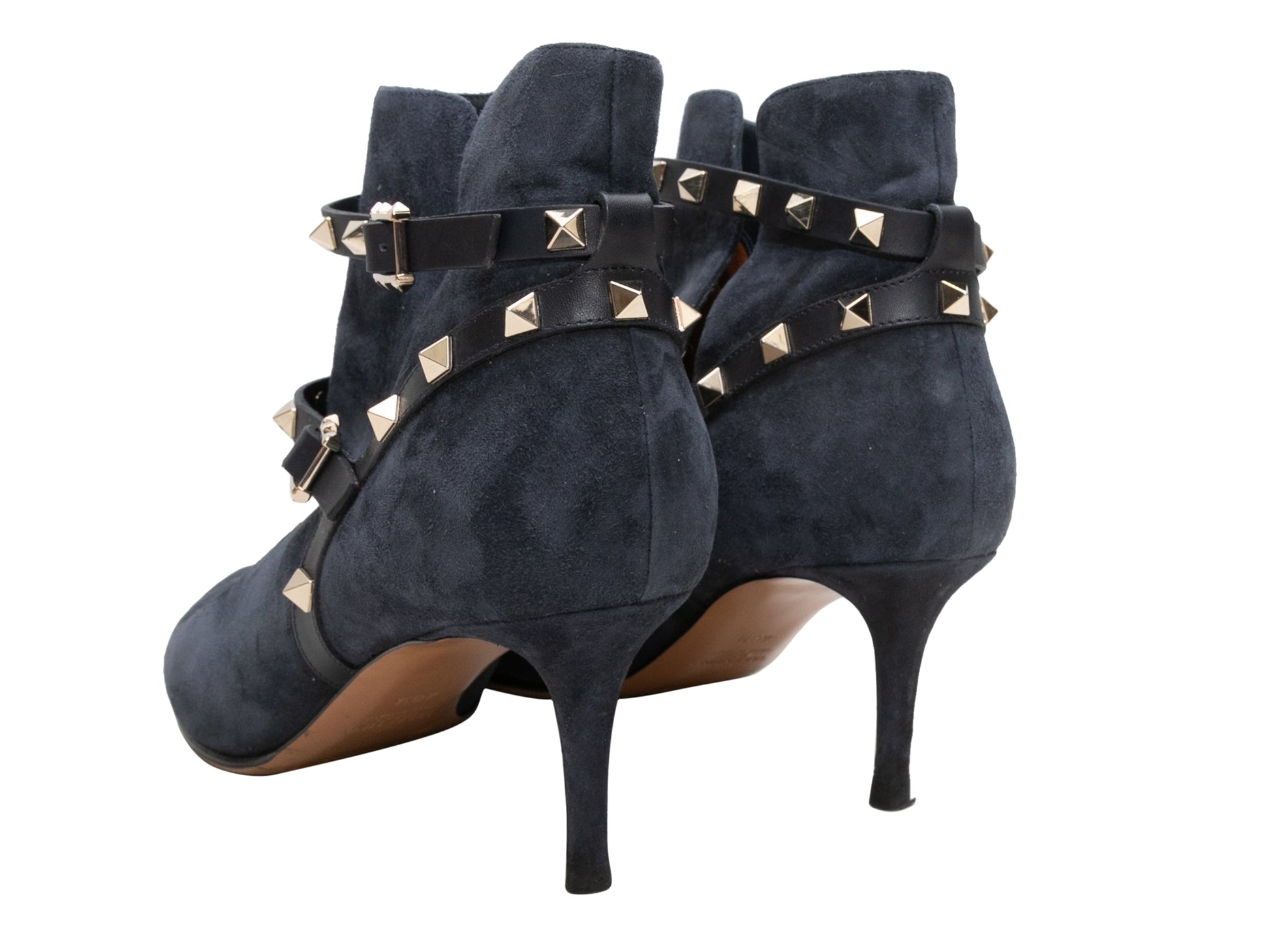 Product Details: Navy suede and leather heeled pointed-toe ankle boots by Valentino. Gold-tone Rockstud embellishments throughout. Buckle closures at exterior sides. 4.5" shaft height, 2.75" heel height.
