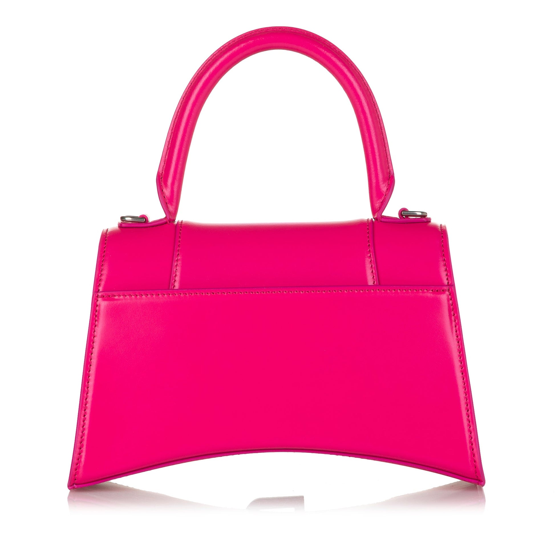 Product Details: Pink Balenciaga Hourglass Leather Satchel. The Hourglass features a leather body, a rolled leather handle, a detachable flat leather strap, and a front flap with magnetic snap button closure. 5.5" L x 8.7" W x 3.5" D, 3.9" drop. Serial number 593546-5011-U-568008.