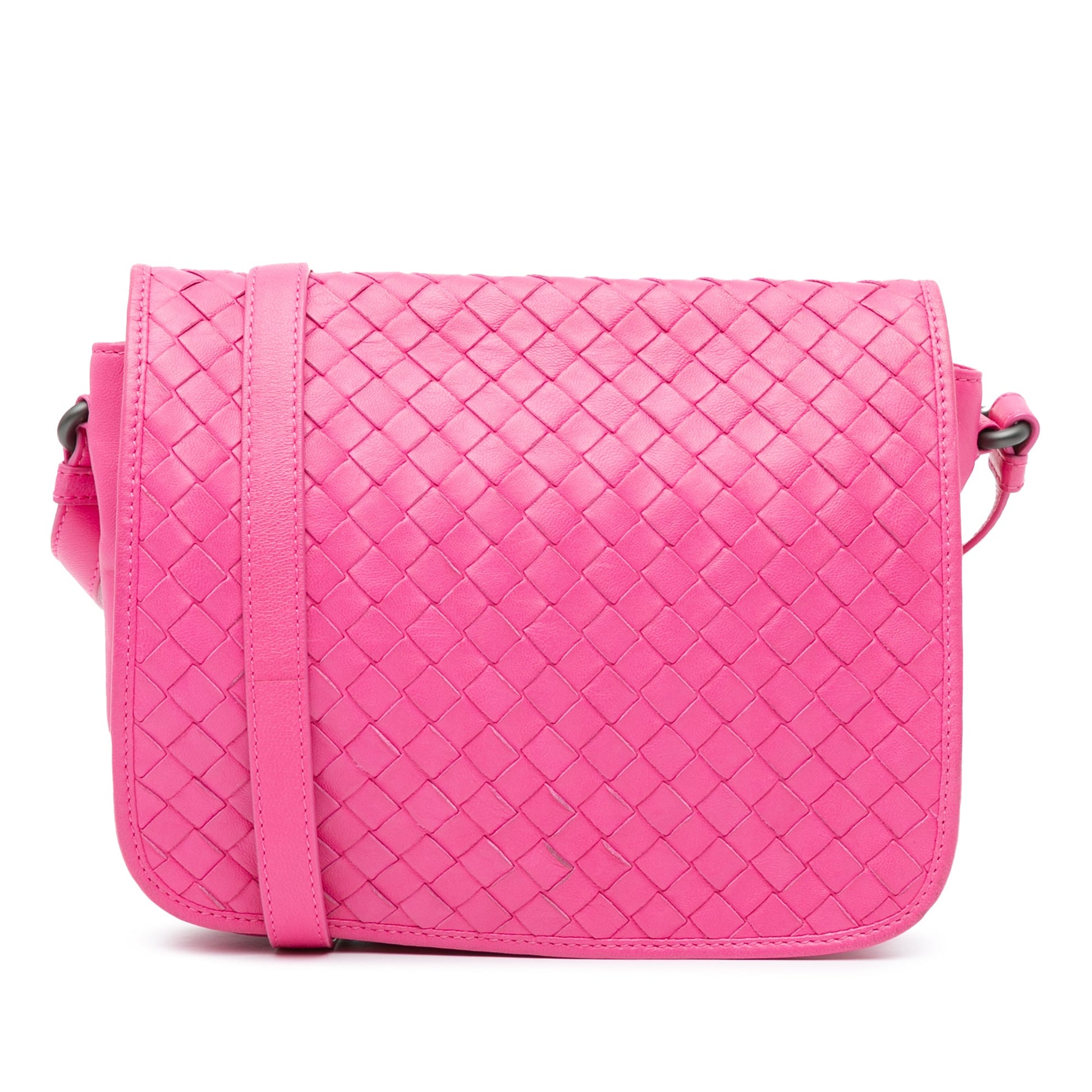 Product Details: Pink Bottega Veneta Intrecciato Flap Crossbody. This crossbody bag features a woven leather body, an adjustable flat leather strap, a flap with magnetic snap button closure, and an interior zip pocket. 6.7" L x 8.3" W x 2.4" D. Serial number B03456509M.