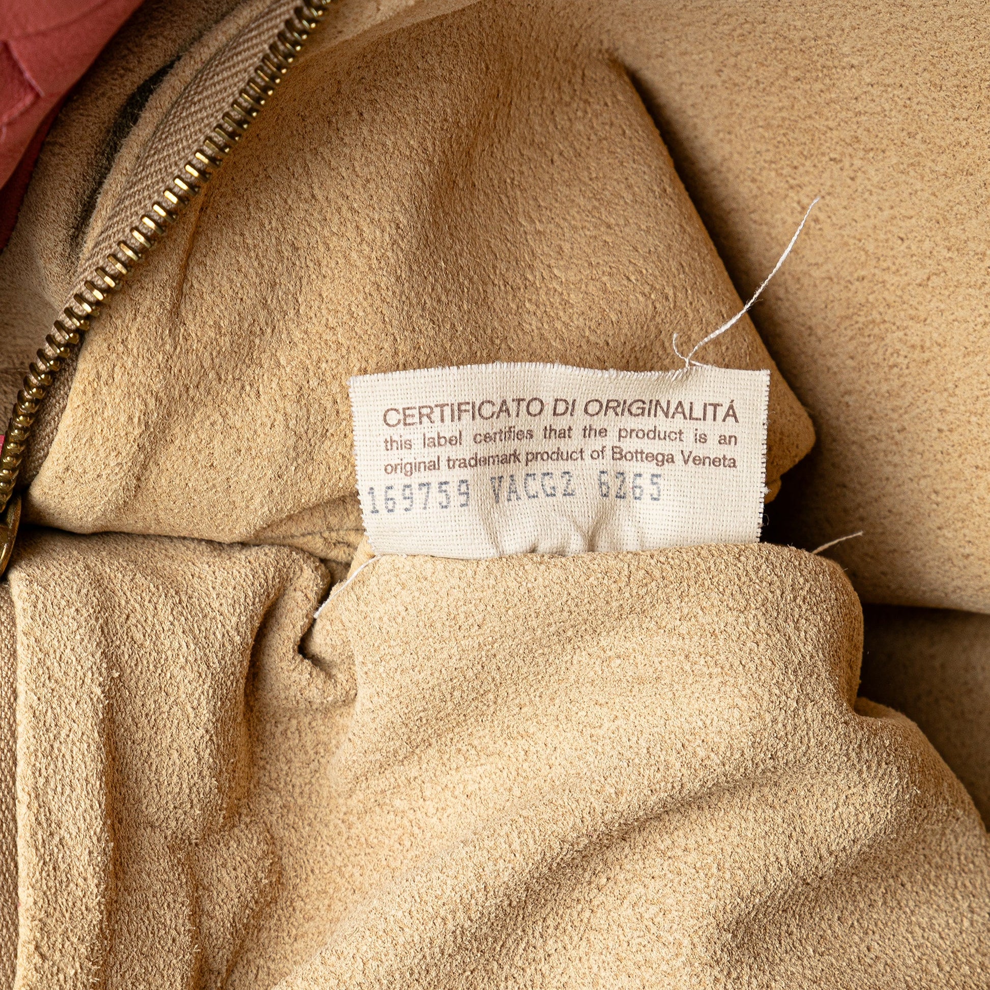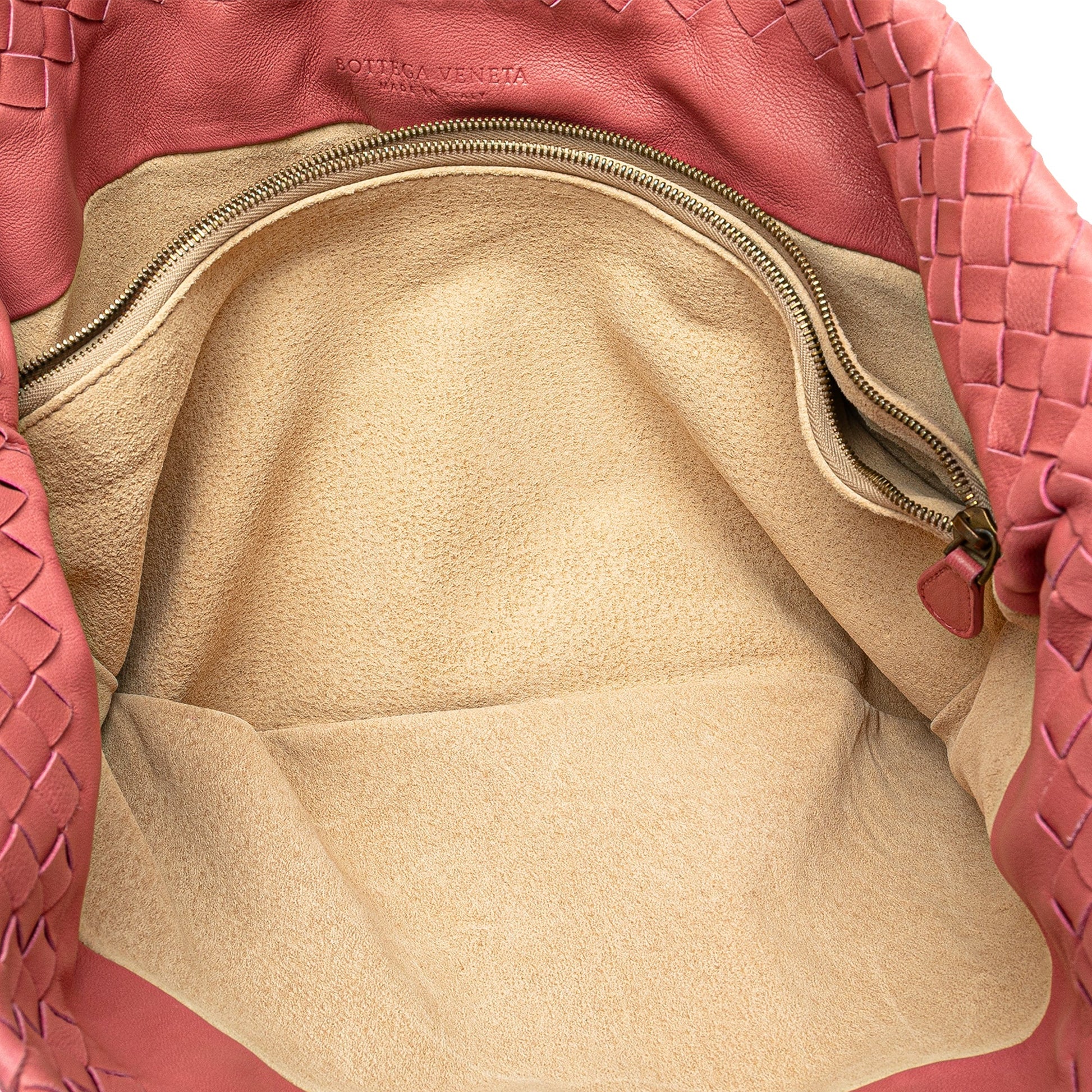 Product Details: Pink Bottega Veneta Intrecciato Marquise Flower Tote. This tote bag features a woven leather body, adjustable flat leather straps, an open top, and an interior zip pocket. 9.1" L x 10.6" W x 5.1" D, 7.9" drop. Serial number 169759.