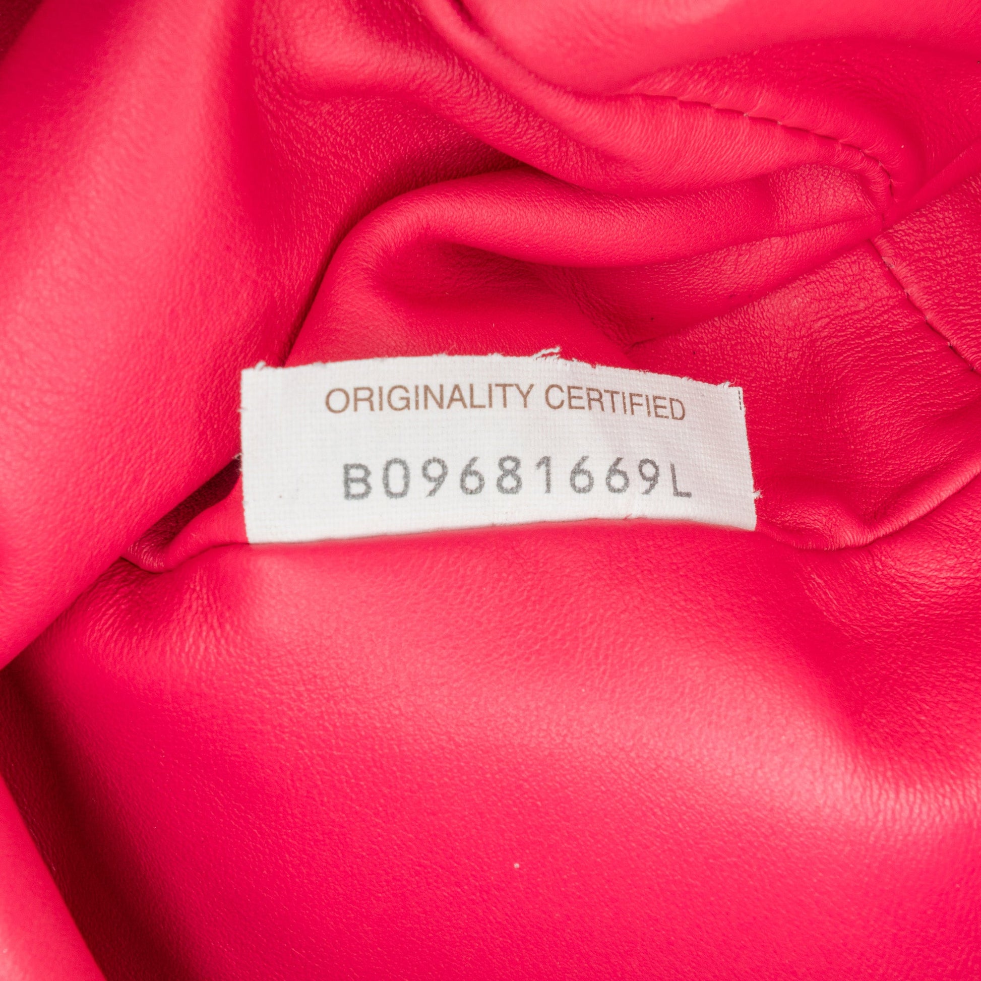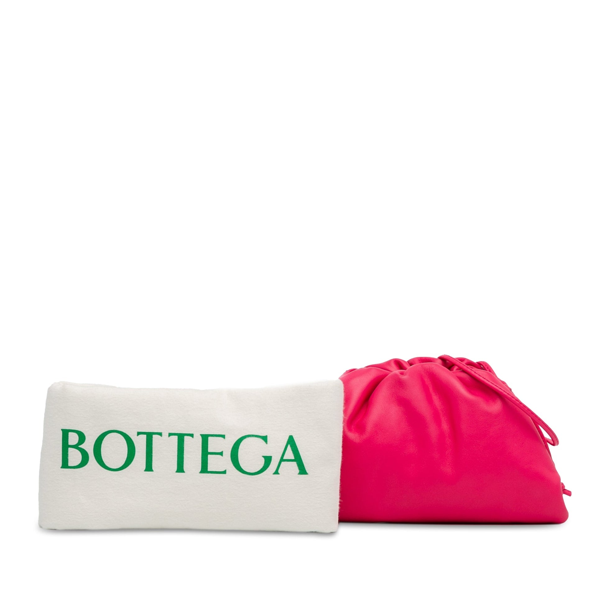 Product Details: Pink Bottega Veneta Lambskin The Mini Pouch Crossbody Bag. The Pouch features a leather body, a flat leather strap, and a magnetic closure. 5.3" L x 7.7" W x 2" D. Serial number BO9681669L.