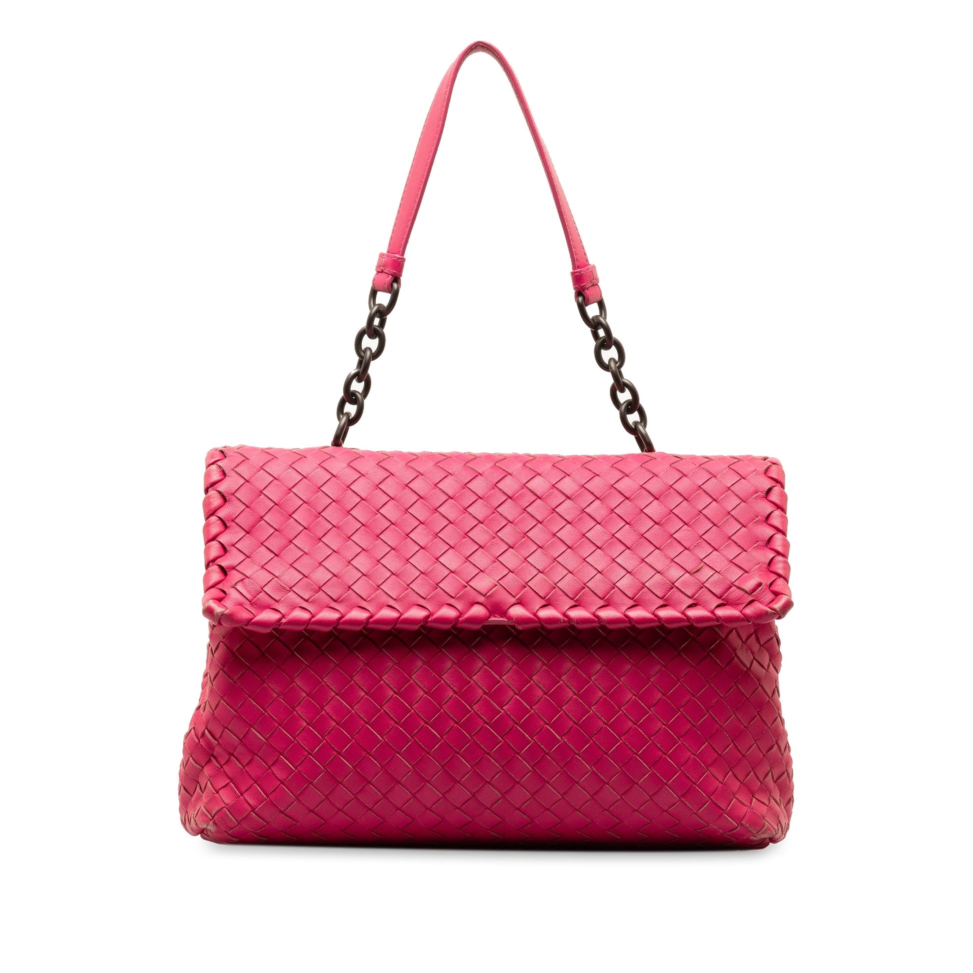 Product Details: Pink Bottega Veneta Large Intrecciato Olimpia Shoulder Bag. The Olimpia bag features a woven leather body, a curb chain strap with leather guard, a top flap with magnetic closure, and interior zip and slip pockets. 7.9" L x 11" W x 3.9" D, 8.3" drop. Serial number B02201016A.