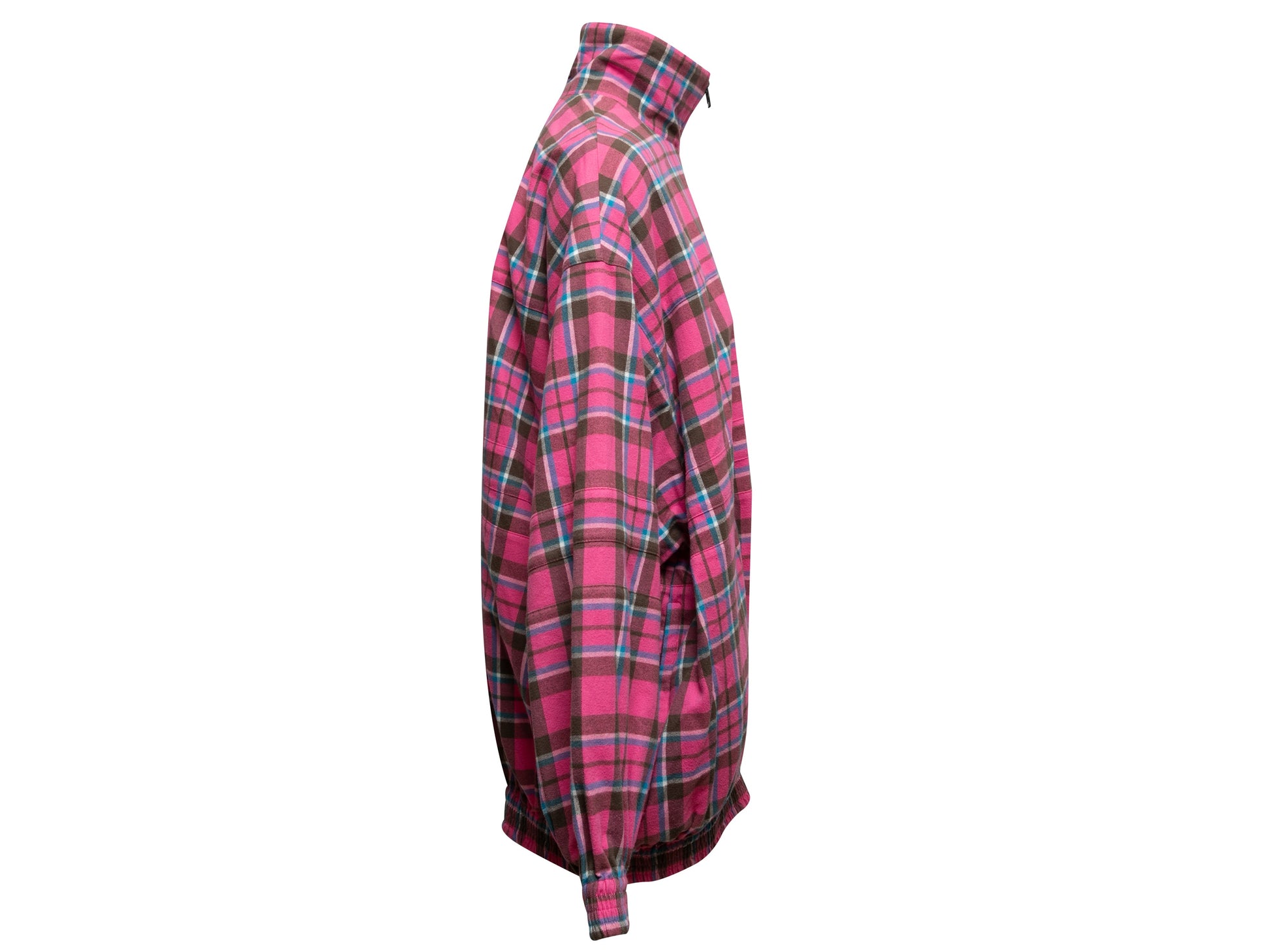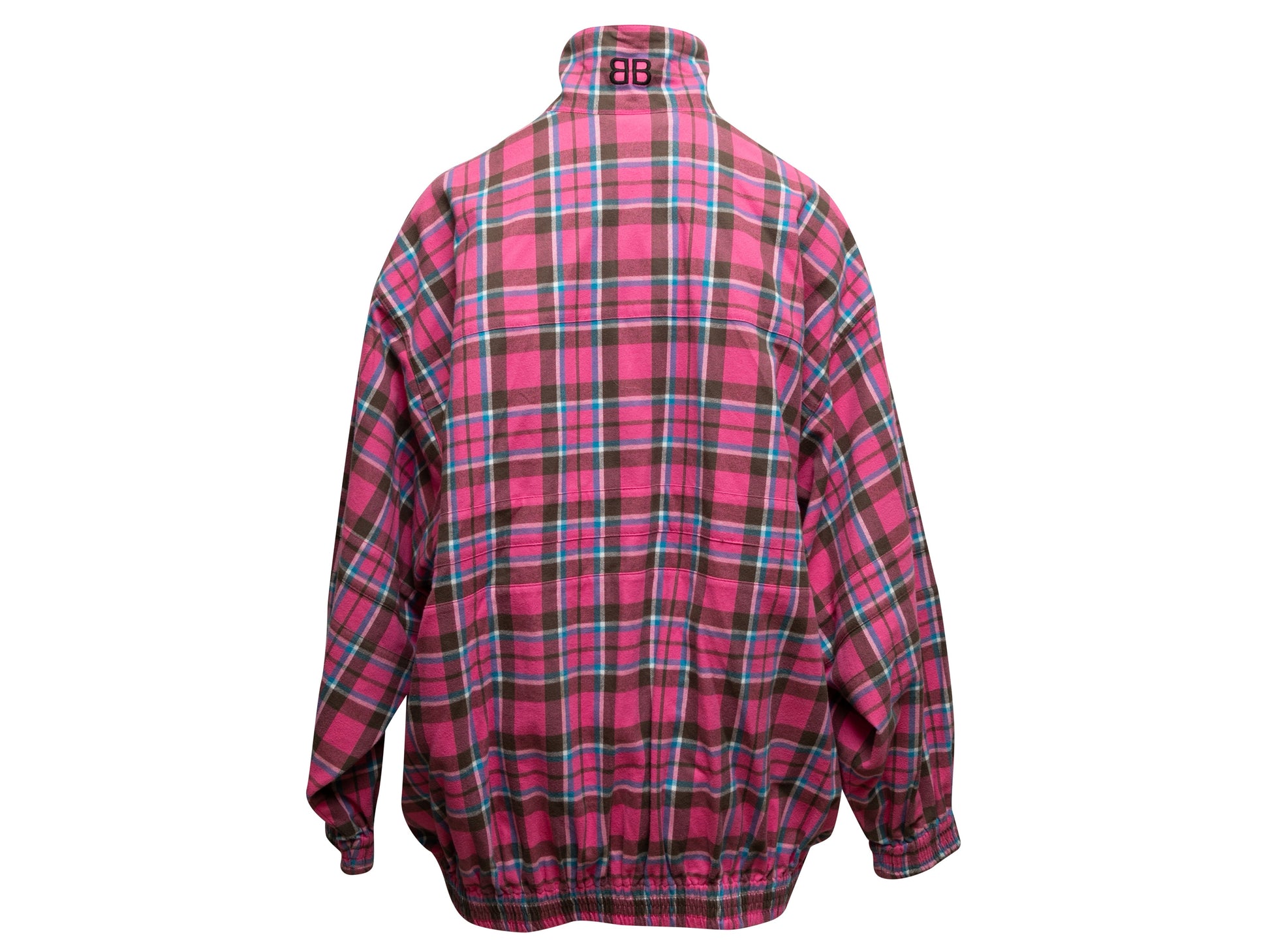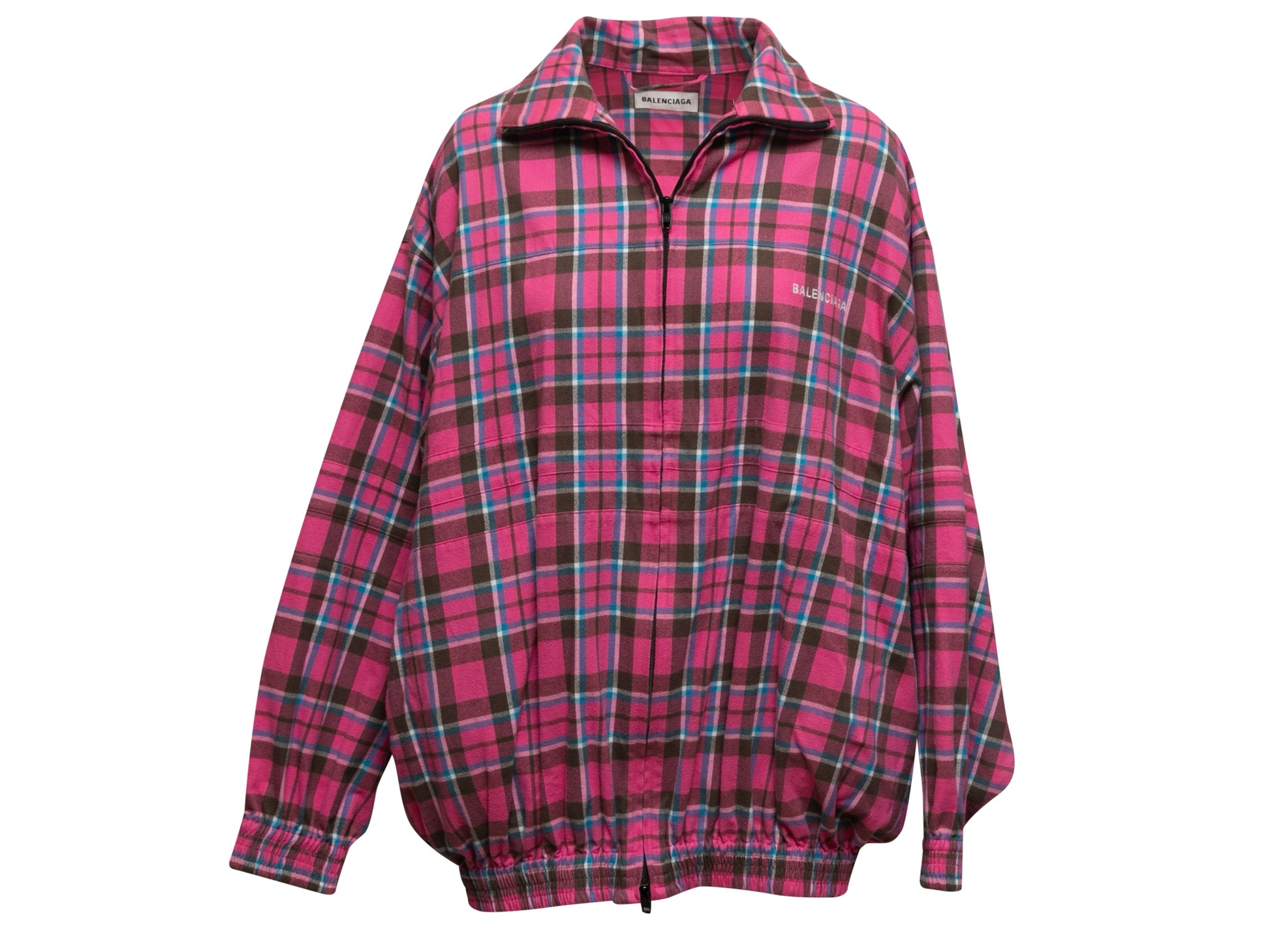 Product Details: Pink and multicolor plaid cotton zip jacket by Balenciaga. Foldover stand collar. Logo embroidery at bust. Zip closure at center front. 52" bust, 23" shoulder width, 22.5" sleeve length, 31" length.