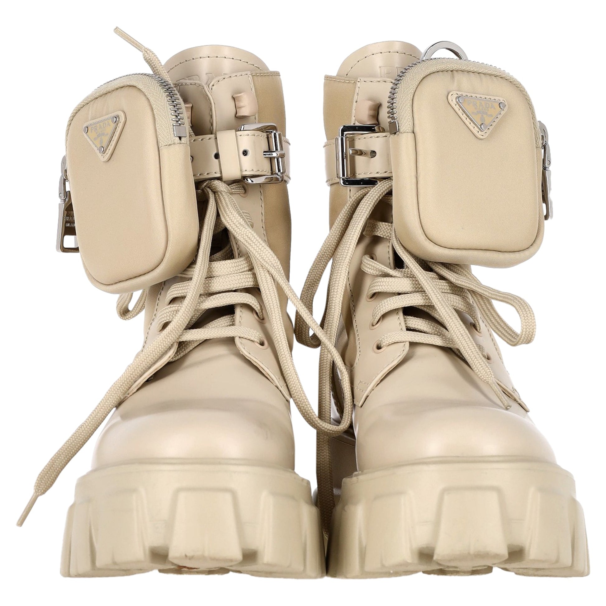Prada Monolith Pouch-Detail Boots in Beige Leather