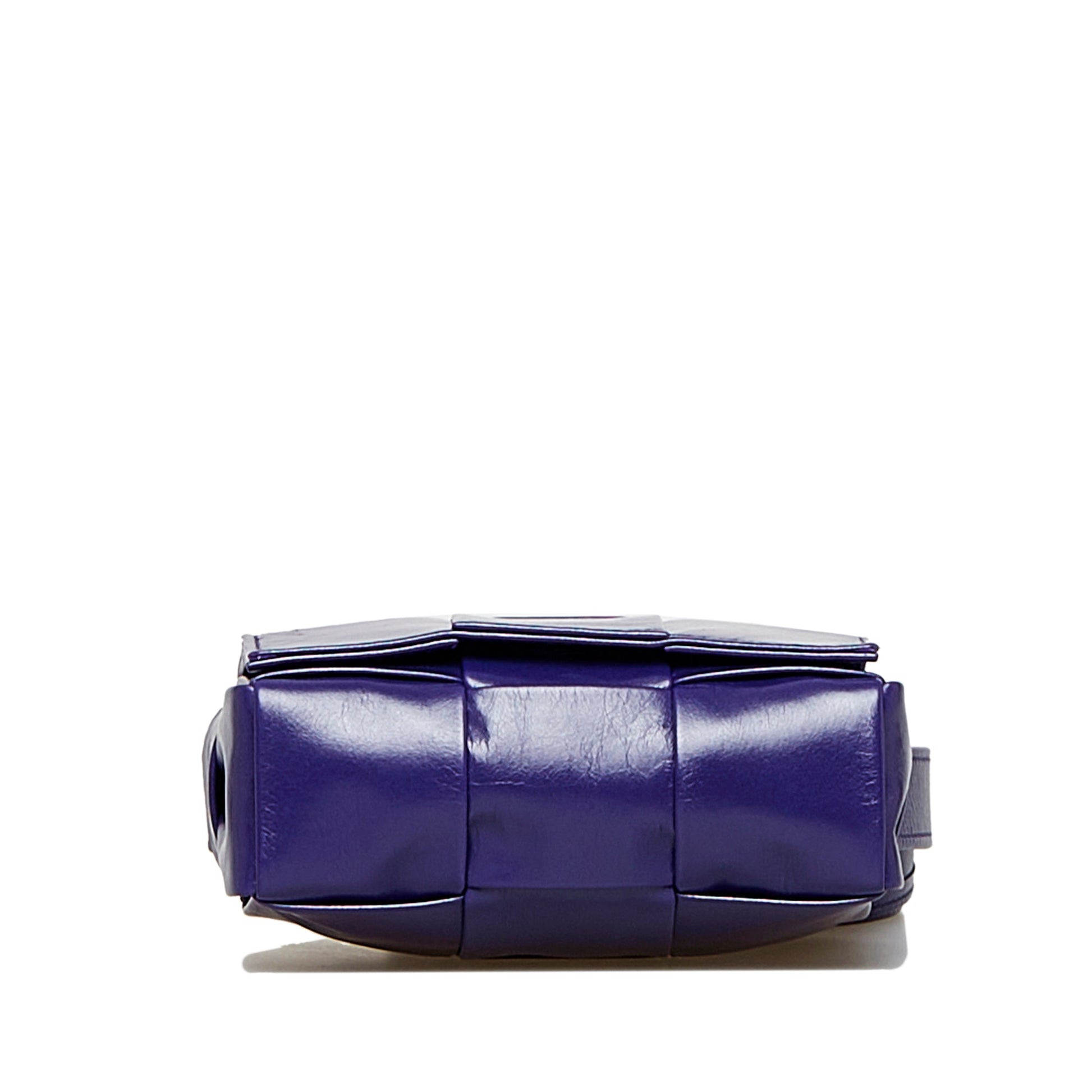 Product Details: Purple Bottega Veneta Candy Nappa Intrecciato Cassette Crossbody. The Cassette features a woven leather body, a flat leather shoulder strap, and a front flap closure. 3.5" L x 5.1" W x 2" D. Serial number P01204482G.