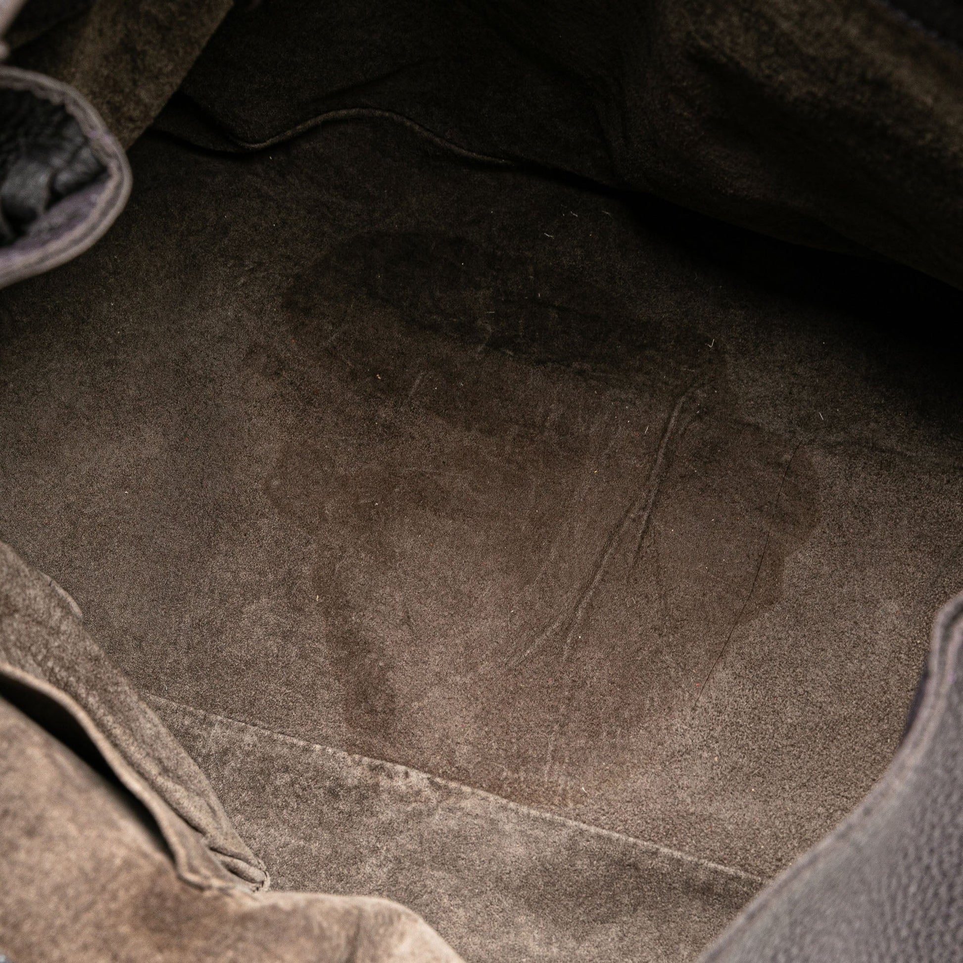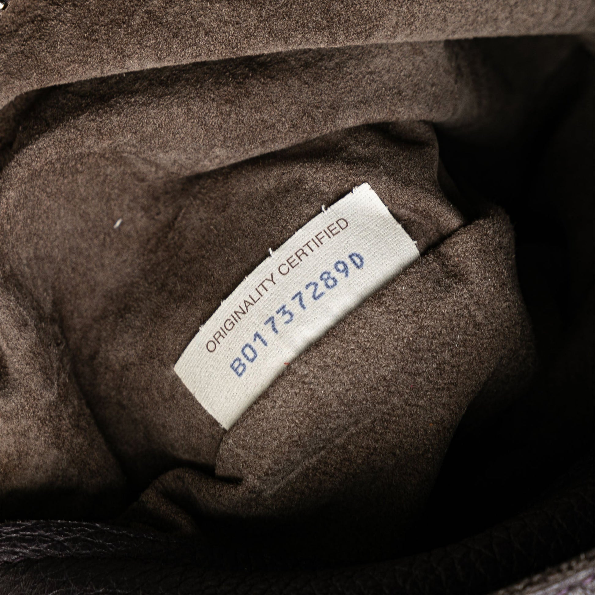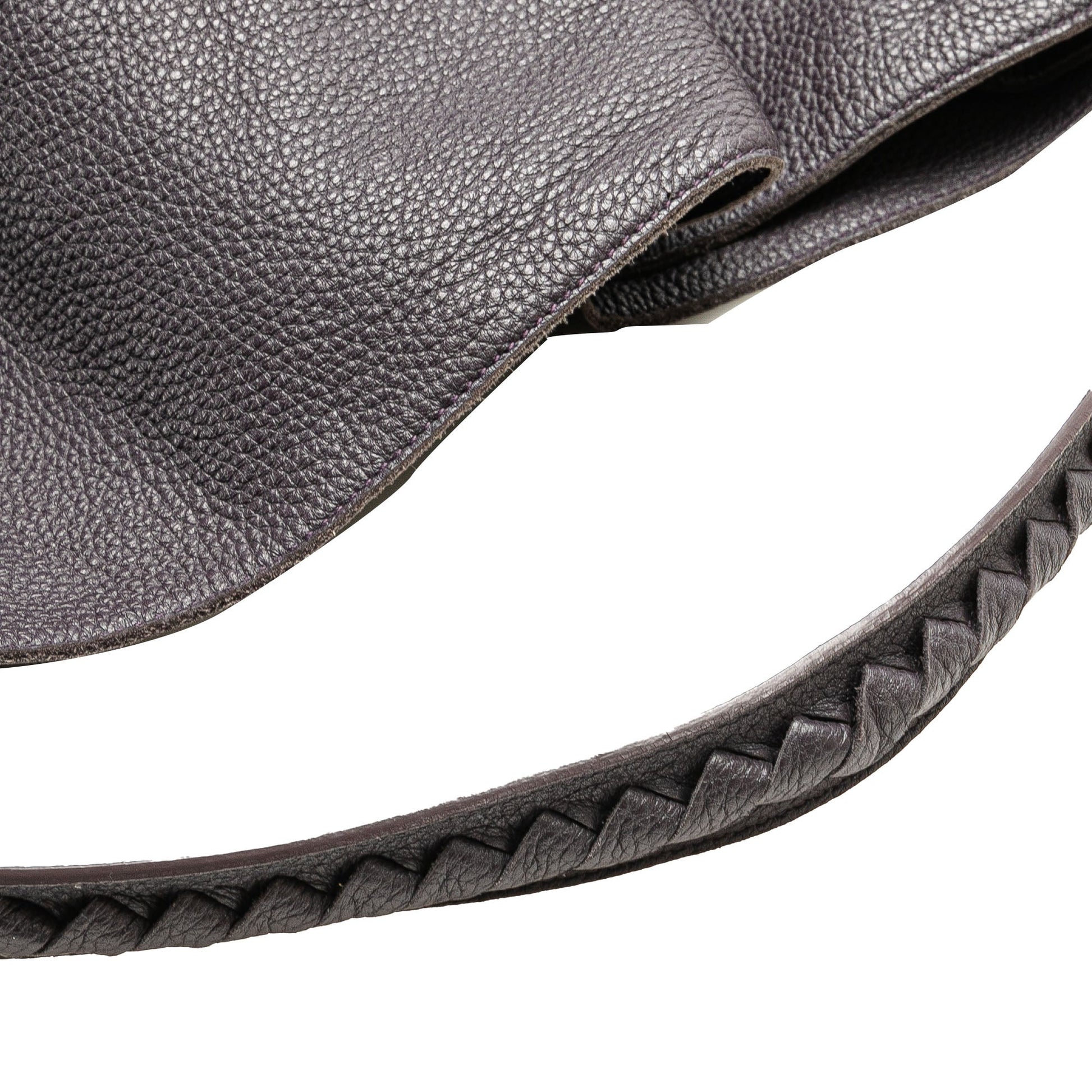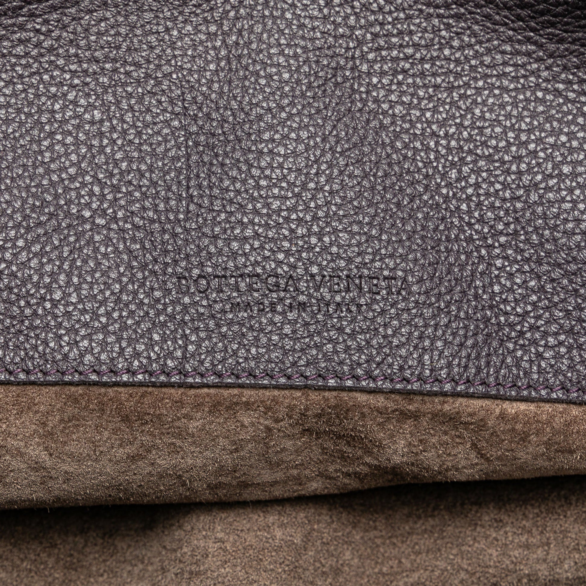 Product Details: Purple Bottega Veneta Intrecciato Trimmed Washed Cervo Shoulder Bag. This shoulder bag features a deerskin leather body with woven details, a flat leather strap, an open top, and interior zip and slip pockets. 11.8" L x 15.7" W x 7.9" D, 7.1" drop. Serial number B01737289D.