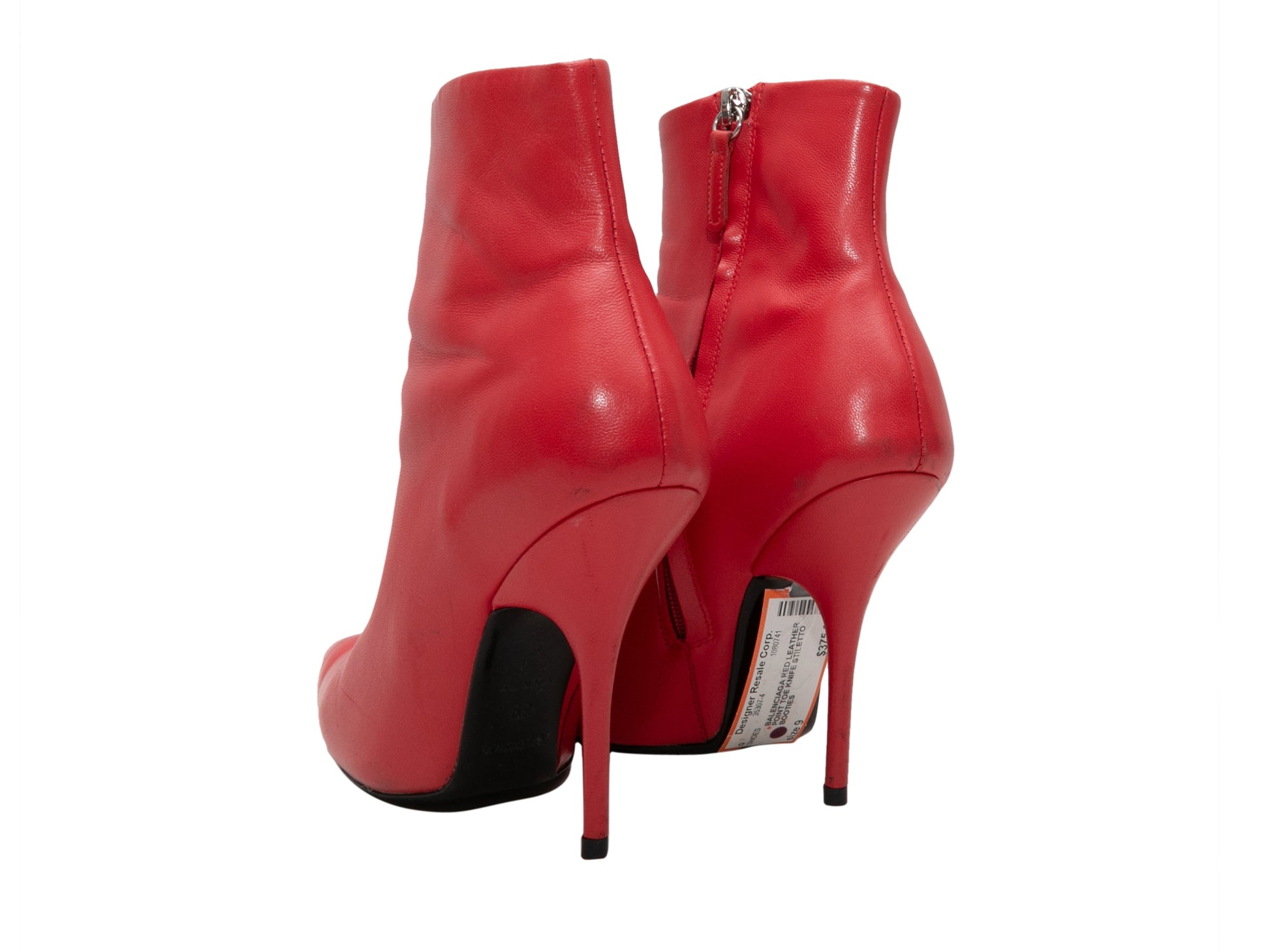 Product Details: Red leather pointed-toe Knife ankle boots by Balenciaga. Spike heels. Zip closures at inner sides. 4.75" shaft height, 4.5" heel height.