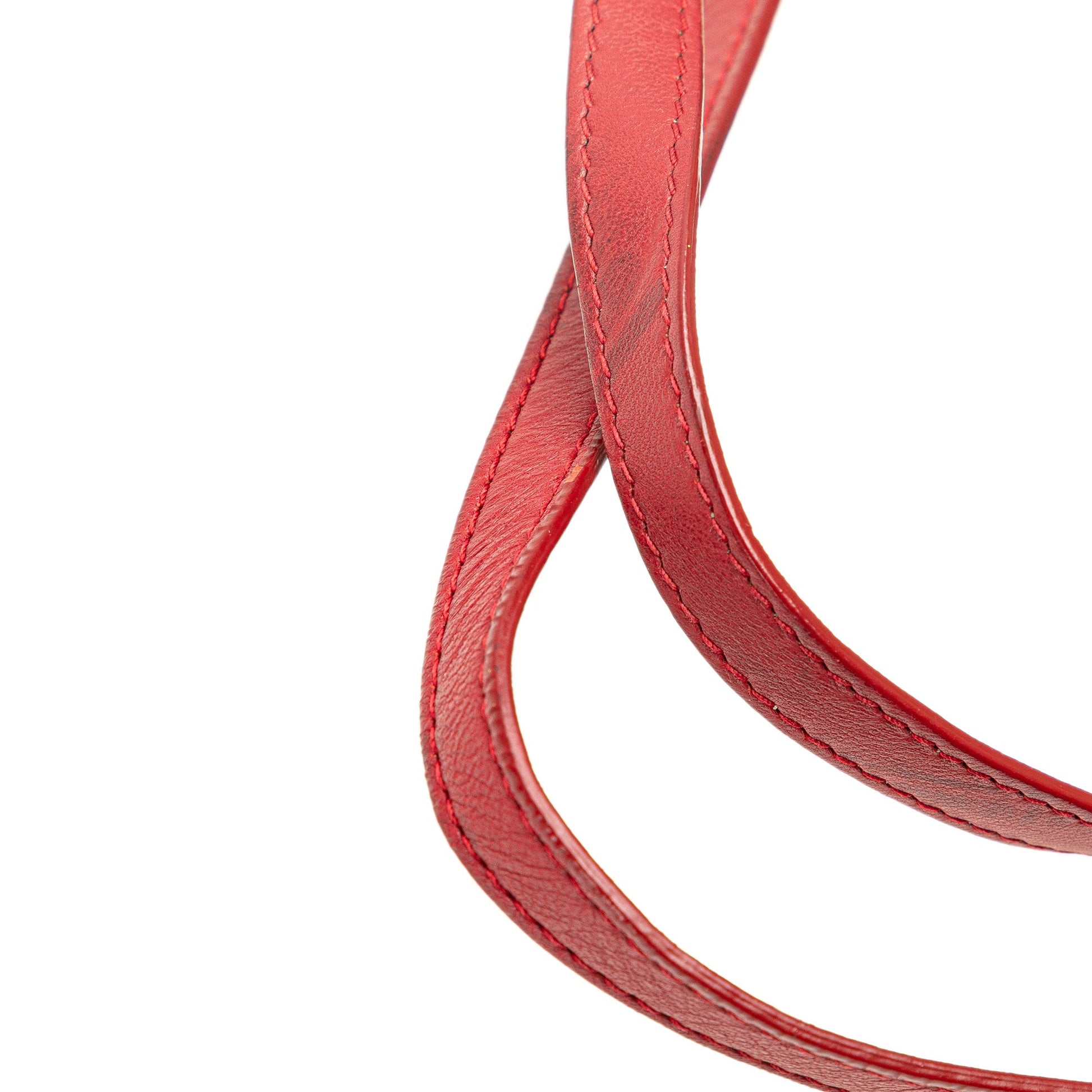 Product Details: Red Bottega Veneta Intrecciato Triple Zip Shoulder Bag. This shoulder bag features leather body with intrecciato weave, a chain link shoulder strap, and triple zip closure at top. 6.1" L x 10.4" W x 1.2" D, 7.5" drop. Serial number B0056 2641Q.