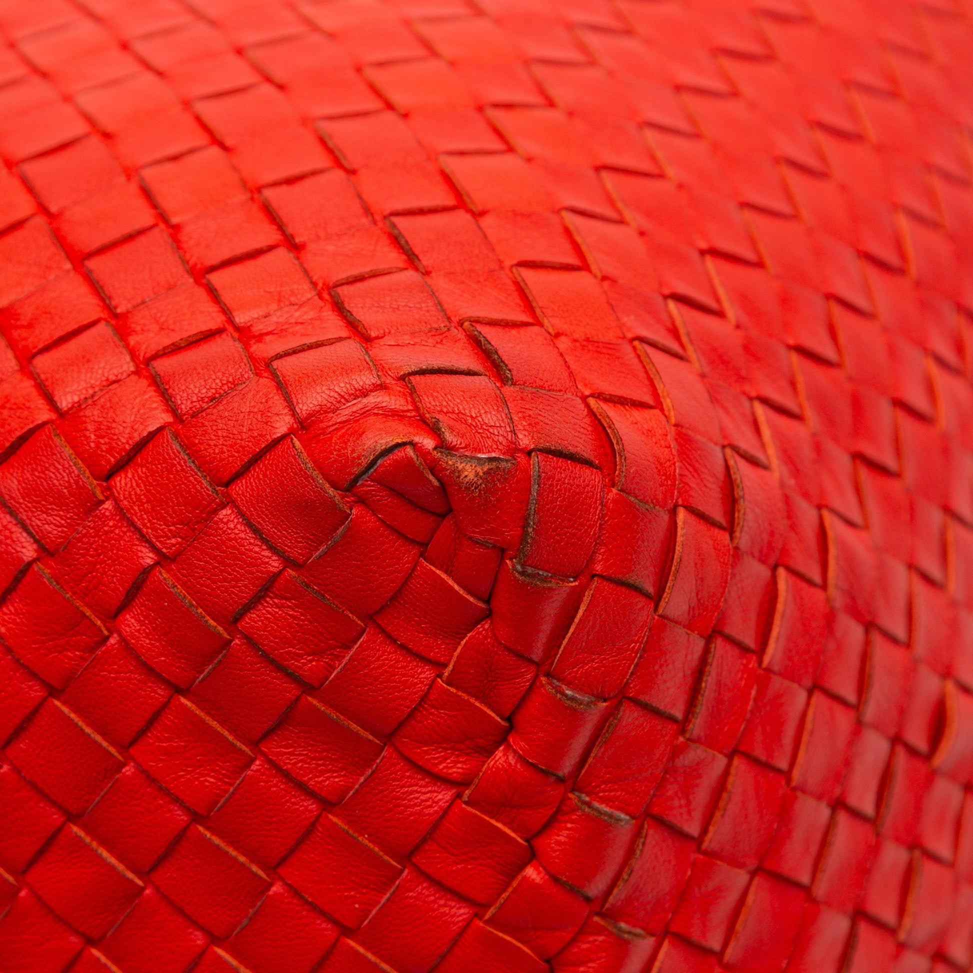 Product Details: Red Bottega Veneta Napp Intrecciato Cube Shoulder Bag. This shoulder bag features a woven nappa leather body, flat leather shoulder straps, dual top zip closures, and an interior zip pocket. 11" L x 16.9" W x 8.7" D. Serial number B00249331F.