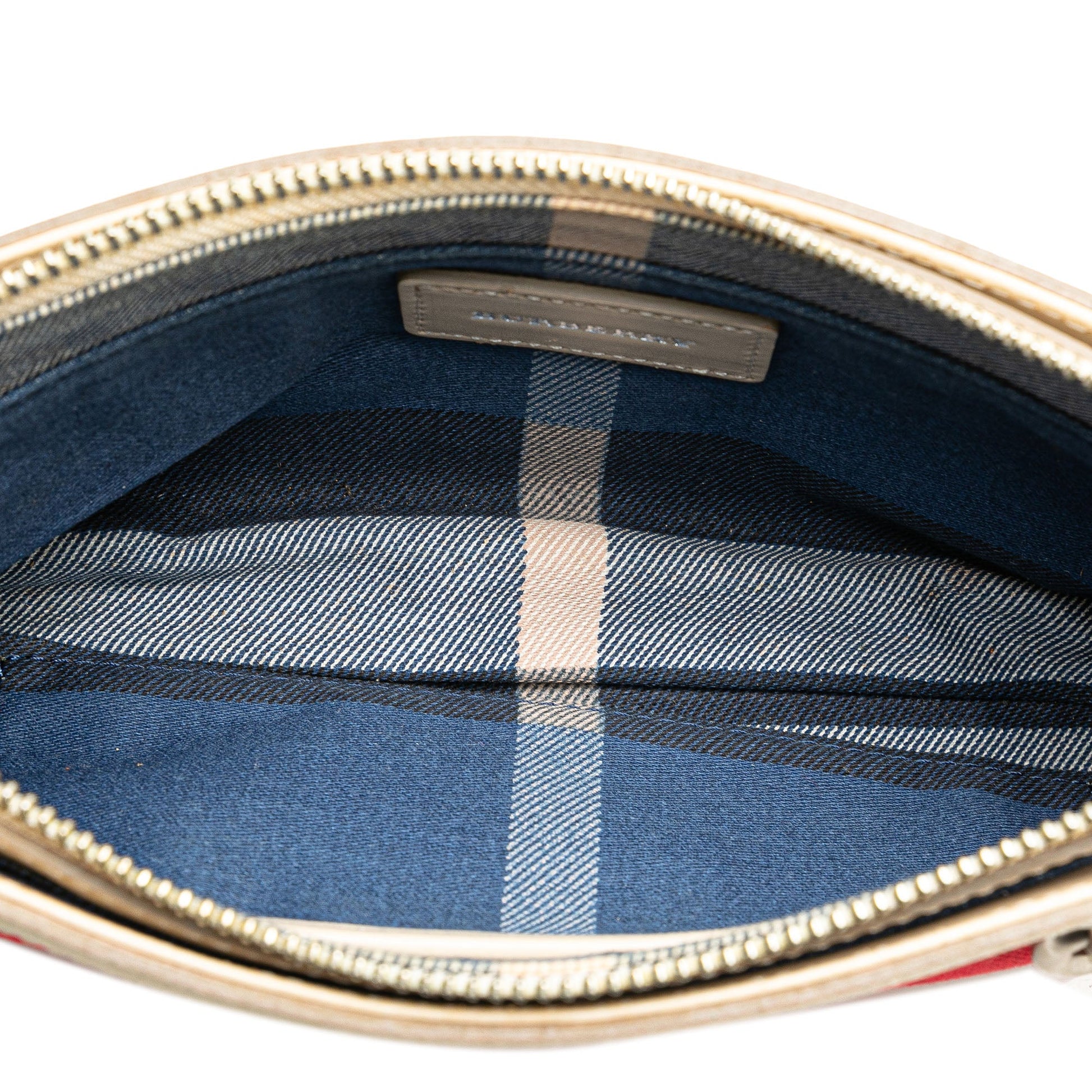 Product Details: Red Burberry Canvas Shoulder Bag. This handbag features a canvas body with leather trim, flat leather strap, a top zip closure, and an interior open pocket. 4.3" L x 9.3" W x 1.2" D, 6.7" drop.