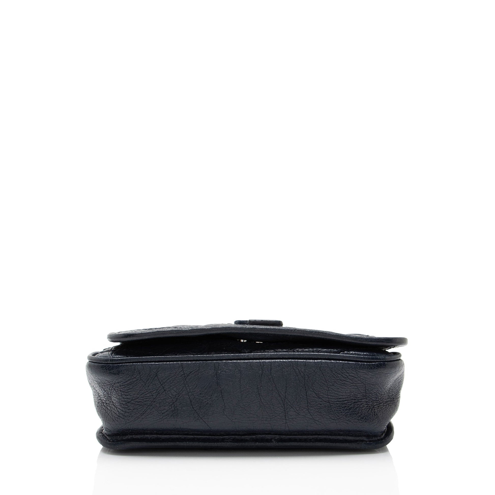 Condition Notes: Darkening to front logo. Creasing and visible discoloration throughout exterior. Scuffs throughout exterior edges and corners. Marks and wear throughout leather on shoulder strap. Surface scratches to hardware. Light marks and wear throughout interior. Please note: Read product details carefully. This is a dark blue bag.