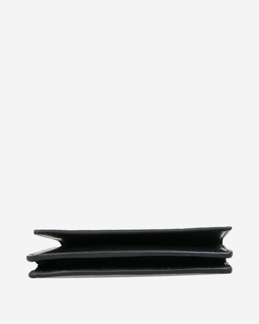 - Descripción: Tarjetero en piel color negro, forma rectangular, abertura con solapa efecto intrecciato, logo característico grabado en el interior