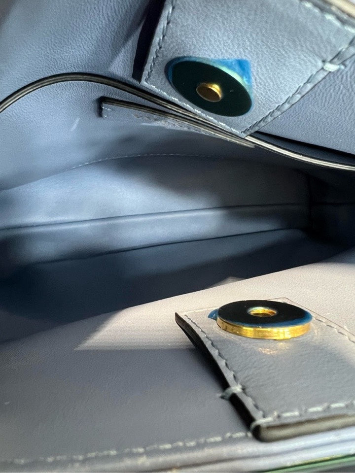 This is an VALENTINO crossbody bag crafted from luxurious blue leather. The bag features gold-toned pyramid stud accents, a top handle, and a detachable leather and chain strap for versatile style. The structured shape is perfect for both everyday use and special occasions, adding a touch of elegance to any outfit. The bag opens to a spacious interior, ideal for carrying essentials with style.