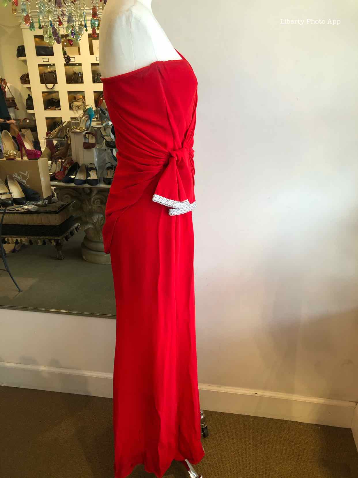 Single shoulder, draped to side w/ bow and silver rhinestones on edge of bow. Slit on front right.