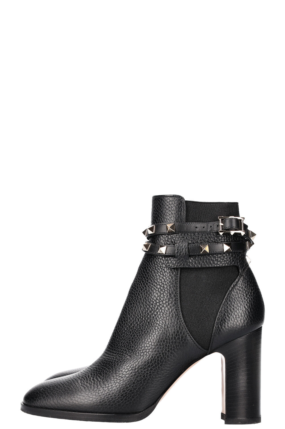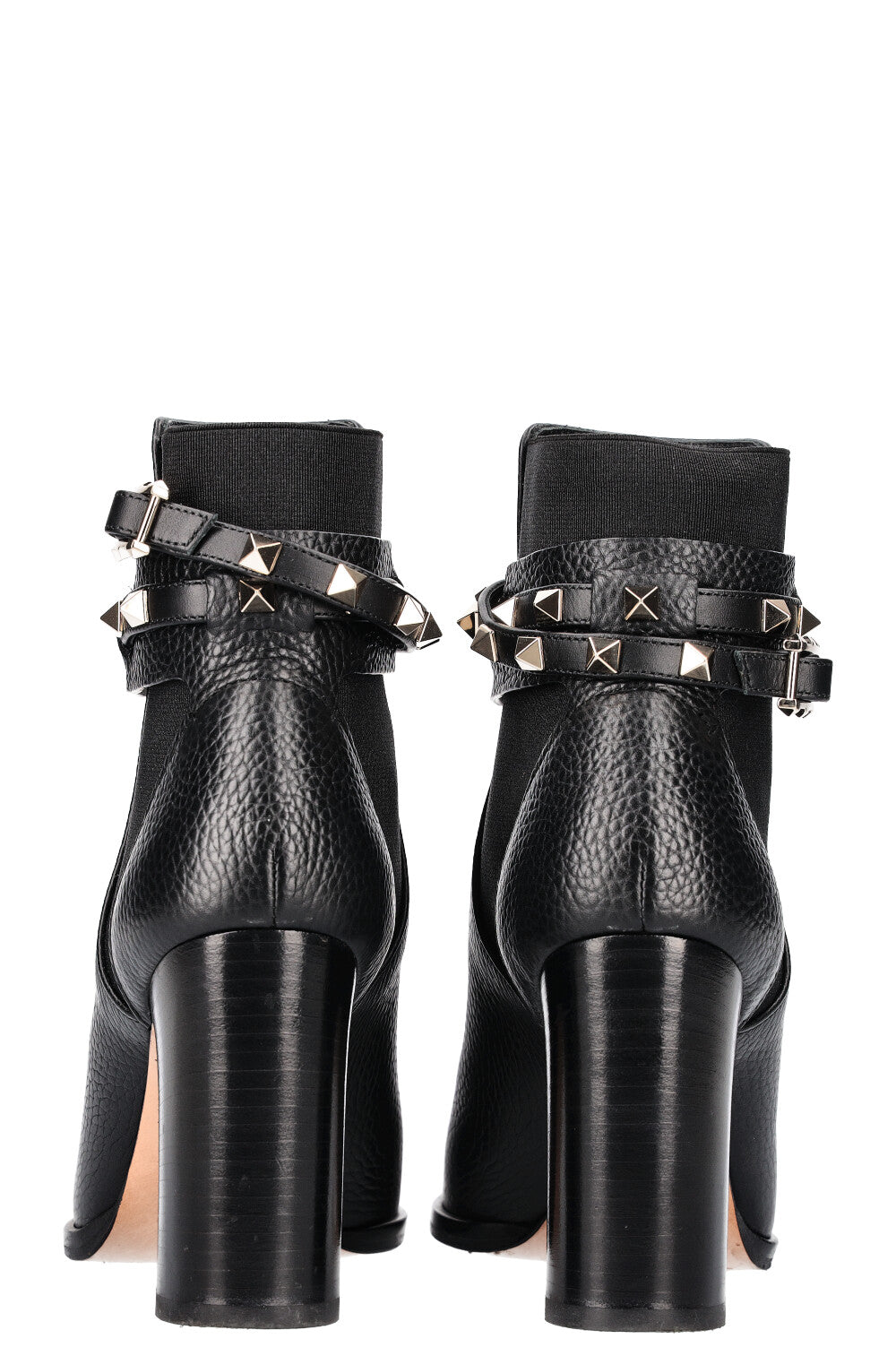 We Love: Stilvolle Valentino Booties mit Blockabsatz und ikonischen Rockstuds versehen. Geprägtes Glattleder und "Champagne" Hardware.