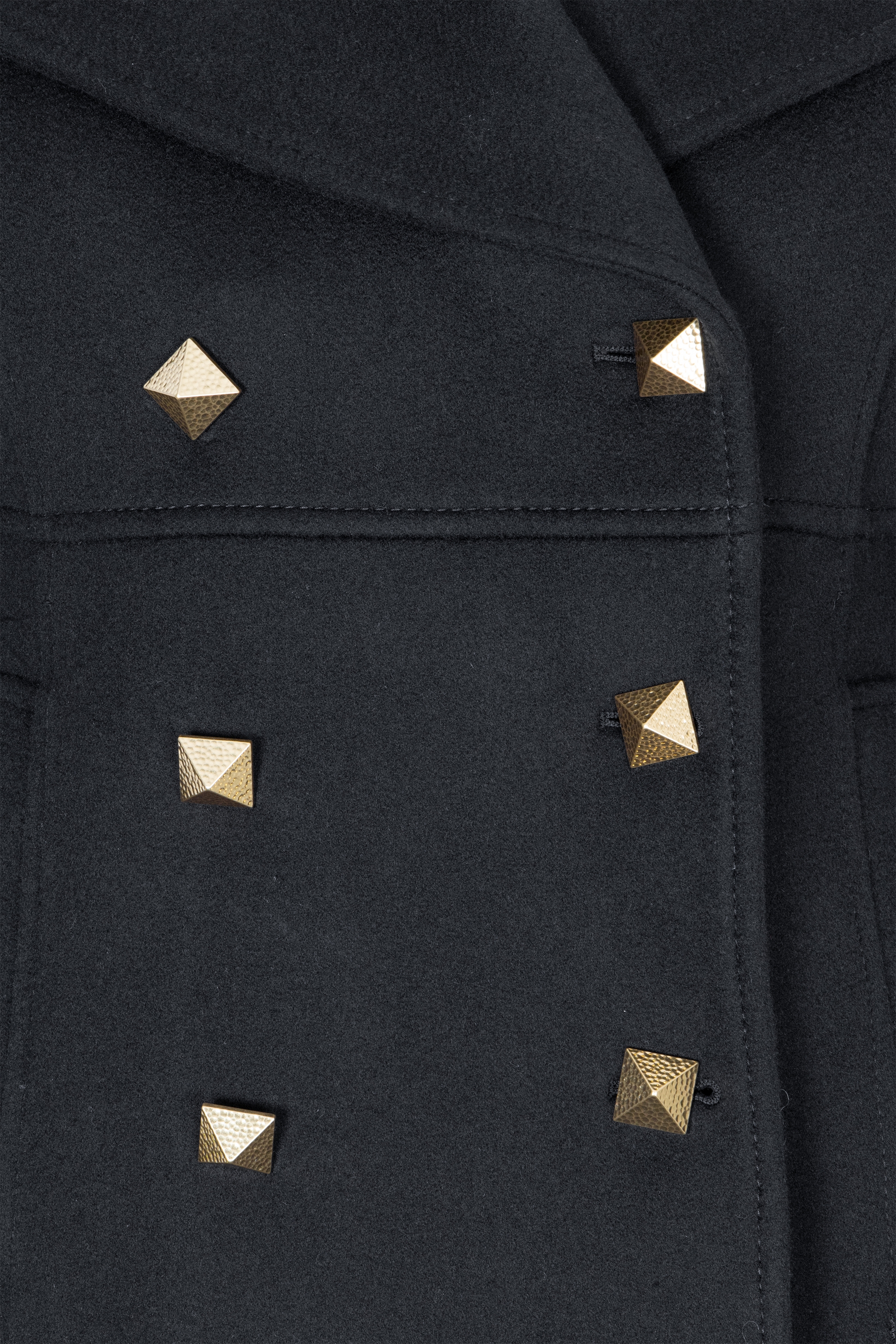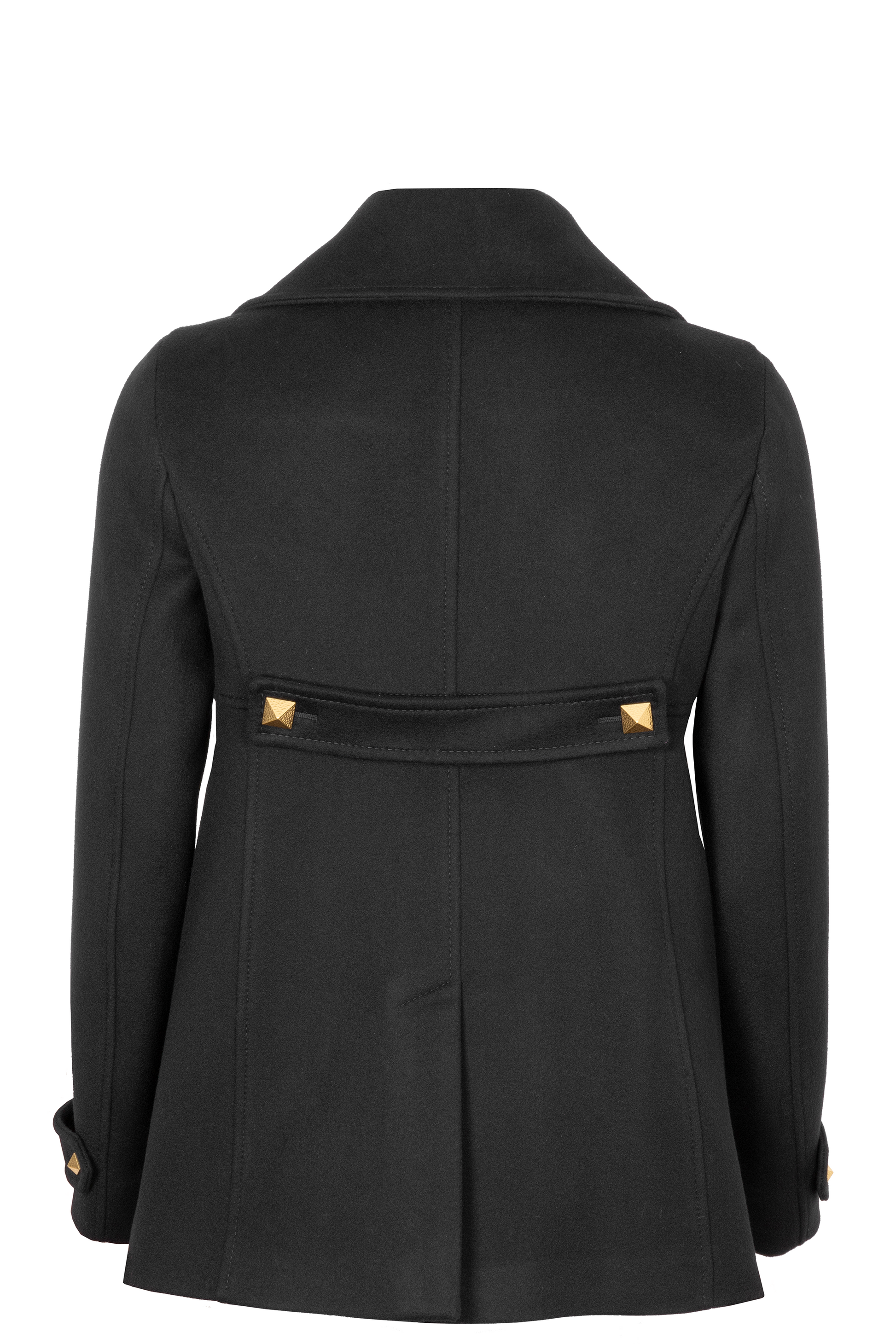Der Valentino Roman Stud Coat in elegantem Schwarz vereint klassische Wollqualität mit modernen Akzenten. Die markanten, goldfarbenen Nieten verleihen diesem Mantel einen einzigartigen und modischen Look, der auffällt, ohne aufdringlich zu wirken. Perfekt für kühle Tage, ergänzt dieser zeitlose Mantel jedes Outfit mit einer stilvollen und luxuriösen Note.