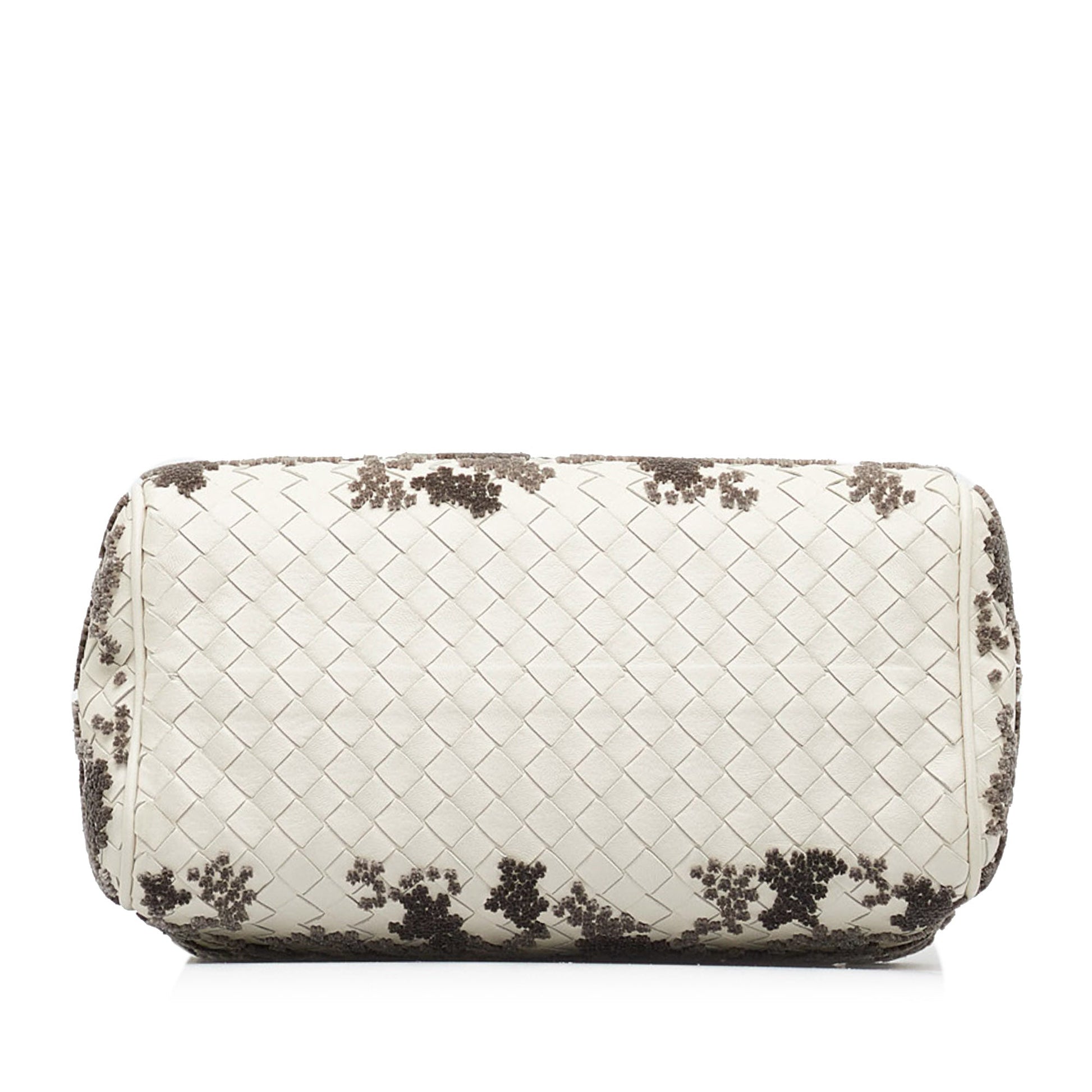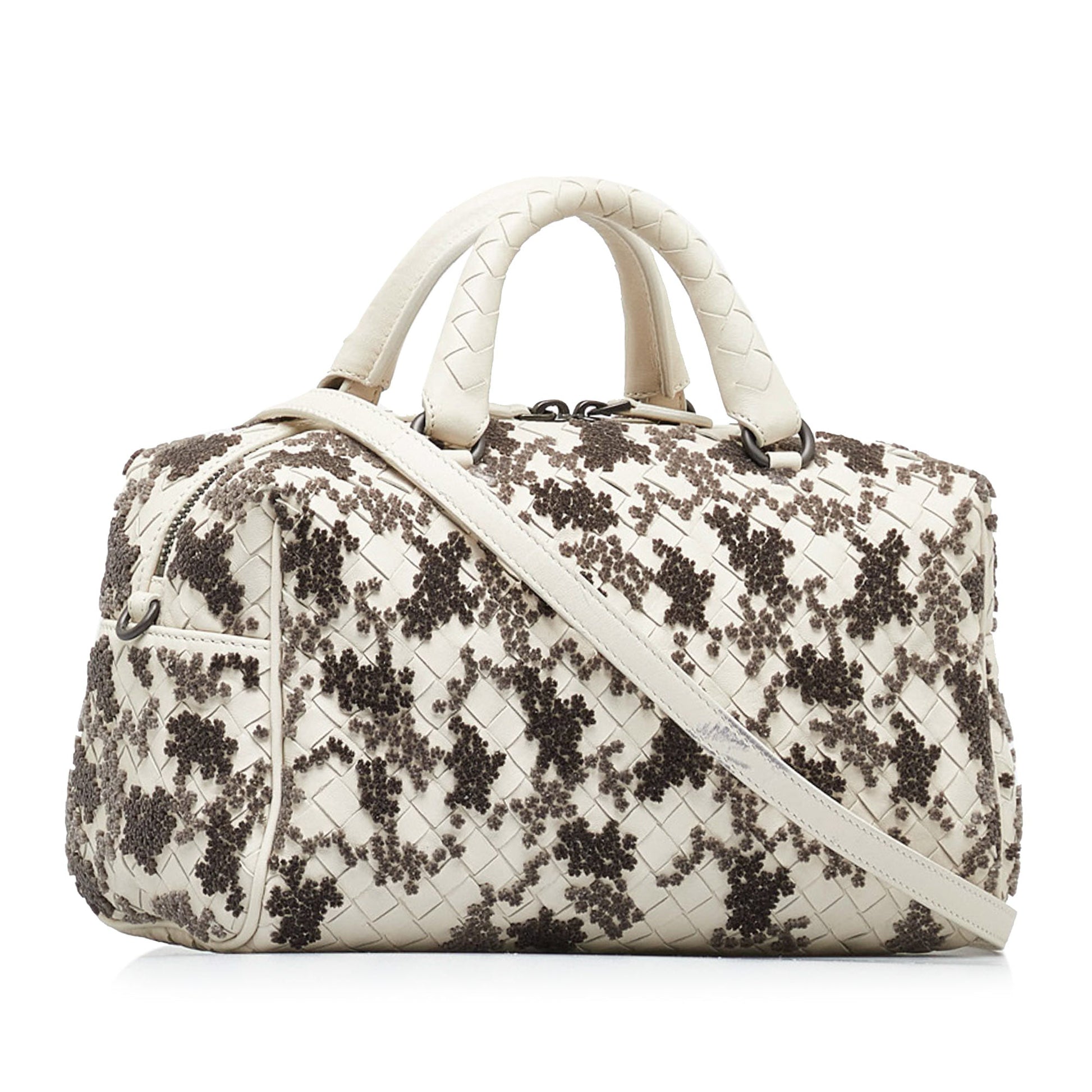 Please note this is a item that may display signs of wear consistent with the condition listed above and shown in photos. Designer Revival this is an White Bottega Veneta In Mist Intrecciato Flocked Velvet Bouquet Duffel Bag Satchel or . .