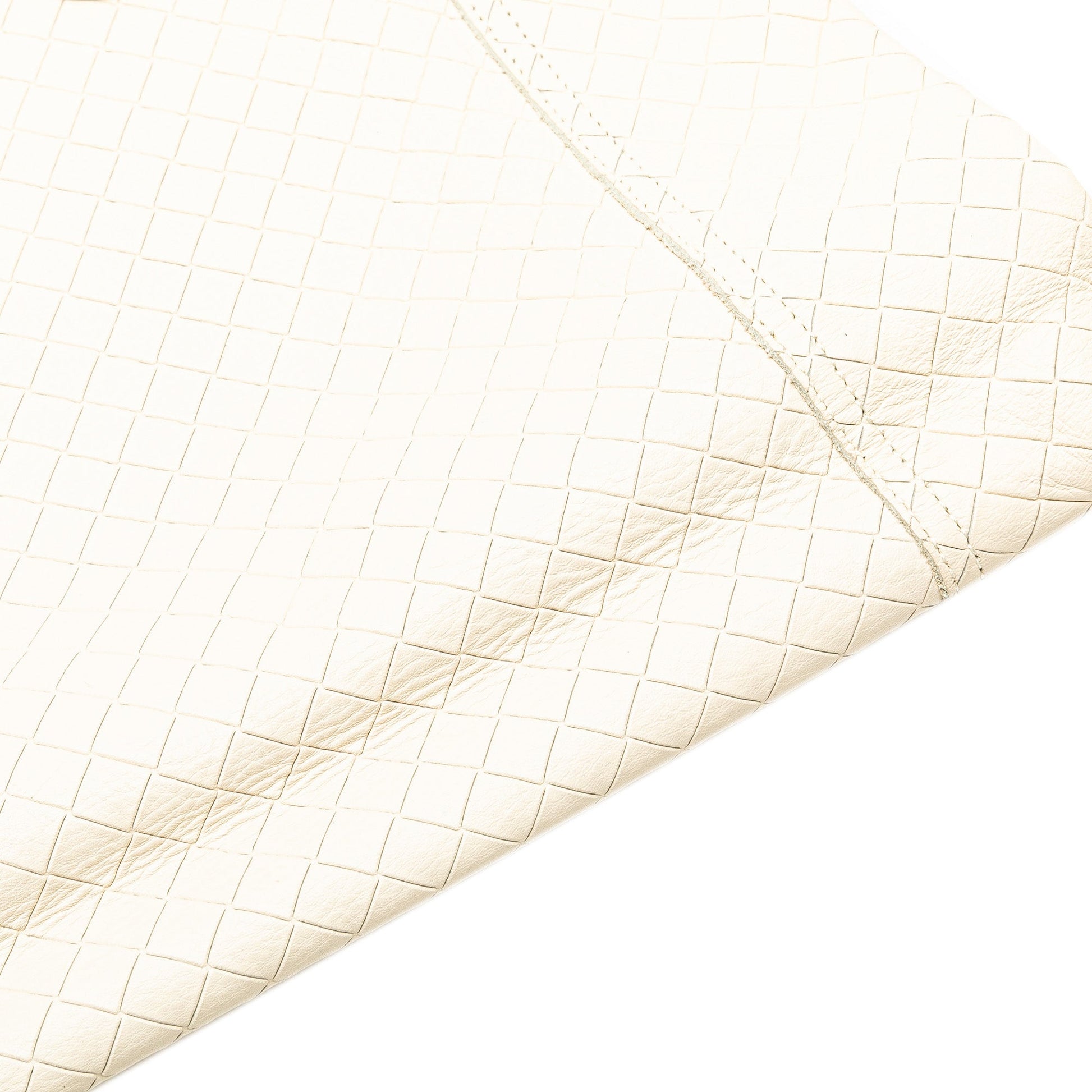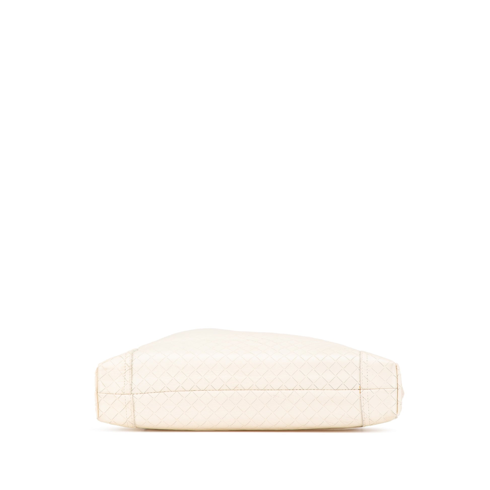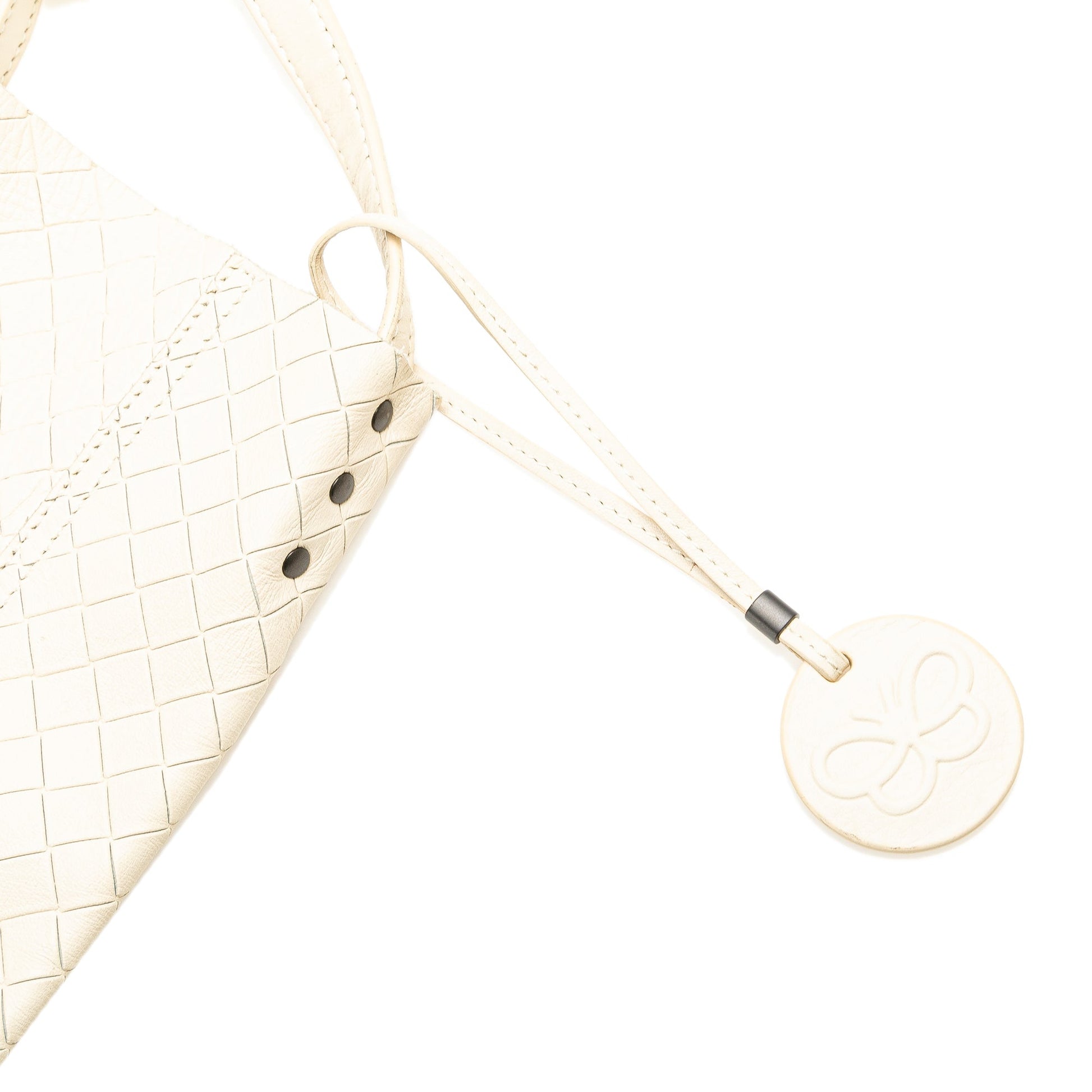 Product Details: White Bottega Veneta Intrecciomirage Crossbody. This crossbody bag features a woven leather body, a flat leather strap, and an open top. 11.4" L x 12" W x 2.2" D. Serial number B01169778Q.
