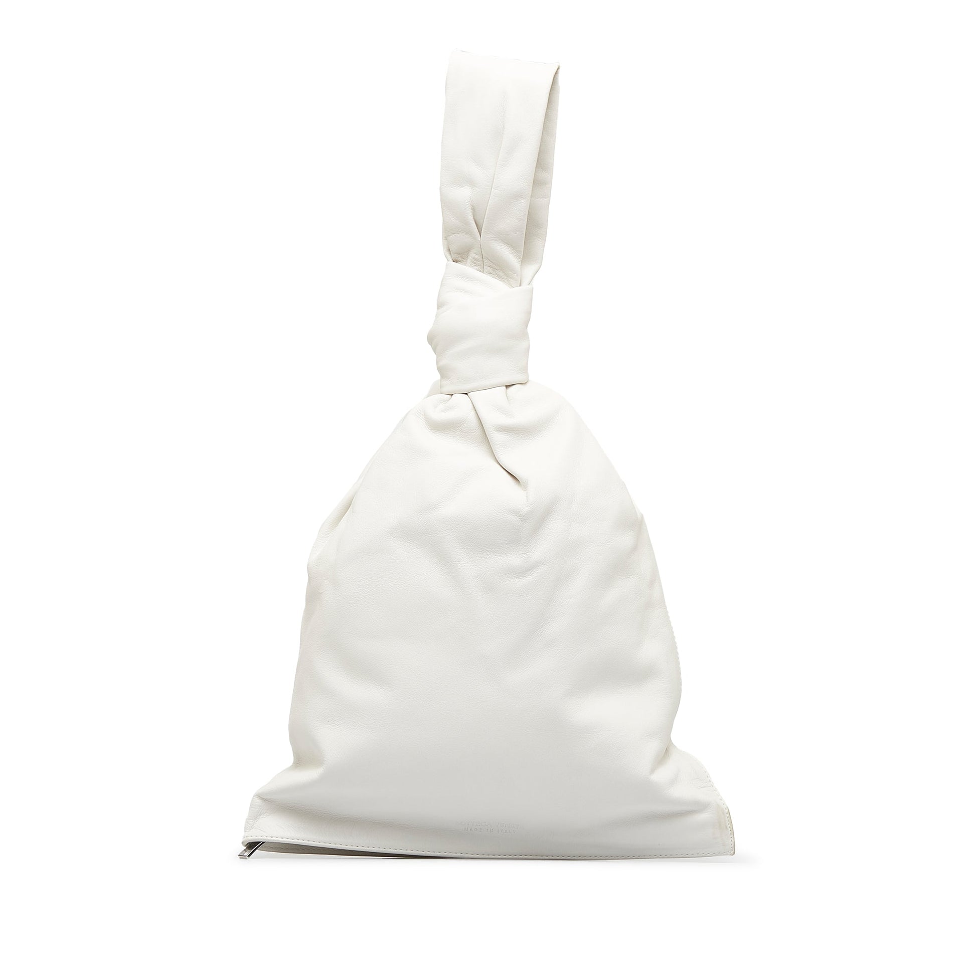 Product Details: White Bottega Veneta The Twist Handbag. The Twist features a leather body, a flat leather handle, and a bottom zip closure. 10.6" L x 12.2" W x 0.8" D, 5.1" drop. Serial number B09071726V.