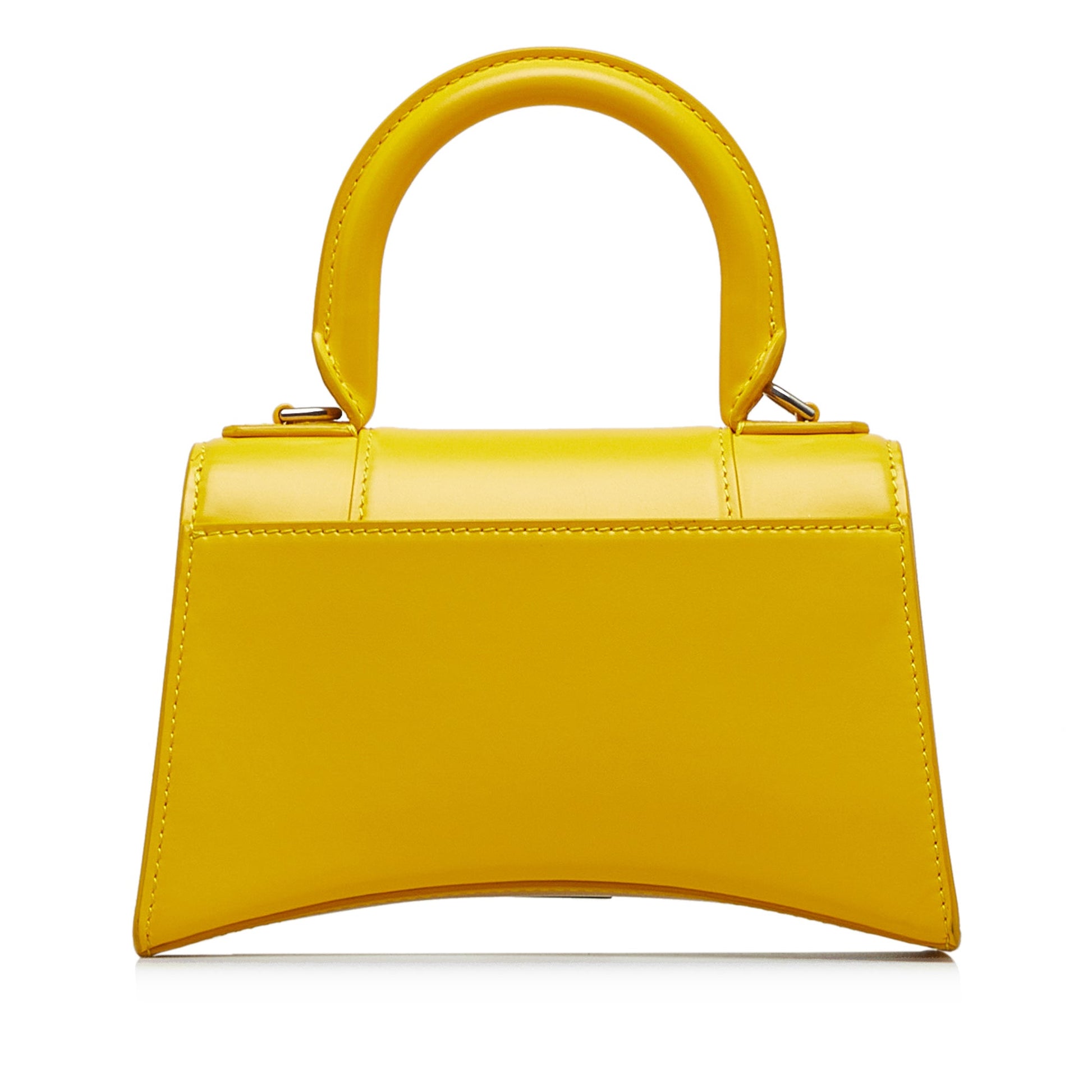 Product Details: Yellow Balenciaga Hourglass XS Satchel. The XS Hourglass features a leather body, a rolled leather handle, a detachable flat leather strap, and a front flap with a magnetic snap closure. 4.7" L x 7.5" W x 2.8" D, 3.1" drop. Serial number V.